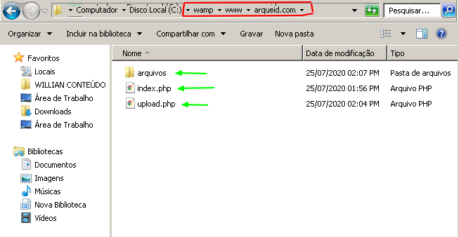 Para fazer um sistema de upload de arquivo(já testado), dentro da pasta do wamp e dentro de www e pasta do "site" deve se criar uma pasta arquivo junto com um arquivo index e um upload como ilustra a figura abaixo: